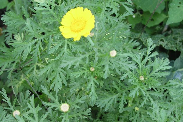 В первый же год испытаний мои симпатии завоевала хризантема овощная. Внешне она несколько напоминает ромашку: растение более одного метра высотой, с красивой резной листвой и желтоватыми цветками. Листовая продуктивность чрезвычайно высока. Вкус листьев очень приятный, они необыкновенно ароматны и вкусны в салатах и как приправа к мясу.