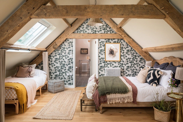 - Не прячьте деревянные балки и стропила — покрасьте их в контрастный цвет или лакируйте, превратив в элемент декора.