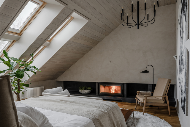 - Выбирайте низкую мебель и встраивайте шкафы в скосы крыши, чтобы меблировка не конфликтовала с архитектурой, а дополняла ее.
