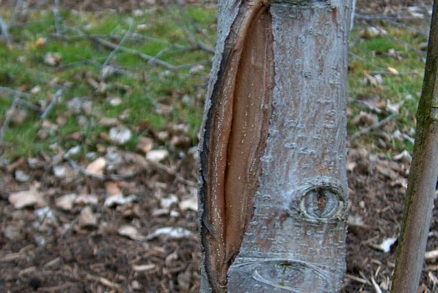 Морозобоина – это наружная трещина, идущая вдоль ствола, более широкая по периферии (снаружи) и суживающаяся к сердцевине. Морозобоина образуется зимой в результате неравномерного охлаждения наружной и внутренней частей ствола при резком понижении температуры. Появляющиеся в связи с этим в стволе напряжения часто вызывают разрыв коры и древесины, в результате чего и возникает продольная трещина. Весной и летом по краям трещины образуется раневая ткань. Трещина уменьшается и затягивается, а морозобоина становится закрытой. Морозобоина может быть и открытой, когда молодая ткань в последующие зимы вновь разрывается, что приводит к загниванию древесины.