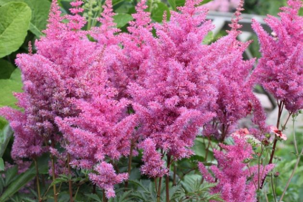 Астильба китайская (A. chinensis) – группа компактных растений высотой около 40–50 см, цветущих в конце лета (Intermezzo – цветки лососево-розовые, Serenada – цветки розово-красные).