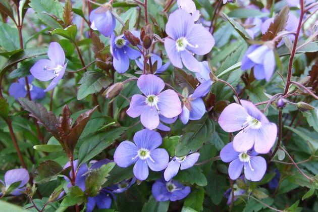 Сорт Джорджия Блю с бронзовыми листьями выглядел настолько очаровательным, что пришлось срочно искать ему место среди камней. В отличие от вероники простертой новосел оказался совсем не агрессивным и образовал небольшую и аккуратную дернинку. Низкие стебли этой вероники в конце мая почти полностью скрываются в облаке голубых цветков. Необычный оттенок листвы украшает альпинарий до поздней осени.